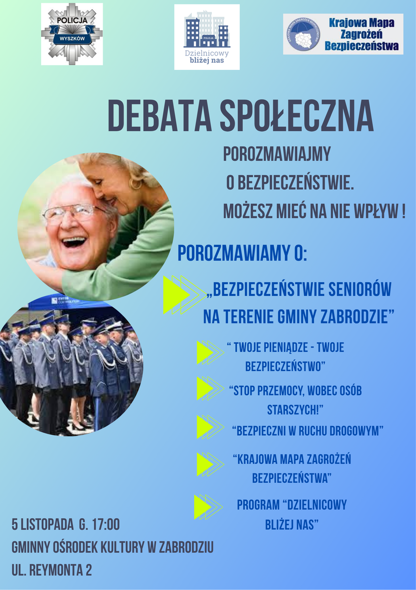 Podczas debaty funkcjonariusze Komendy Powiatowej Policji w Wyszkowie, przedstawią najnowsze metody działania oszustów oraz sposoby, jak skutecznie się przed nimi bronić oraz poruszą kwestie dotyczące bezpieczeństwa seniorów w ruchu drogowym.Zaprezentowana zostanie również Krajowa Mapa Zagrożeń Bezpieczeństwa. Uczestnicy debaty poznają szczegóły programu "Dzielnicowy bliżej nas", którego celem jest wzmocnienie kontaktu mieszkańców z lokalną społecznością.