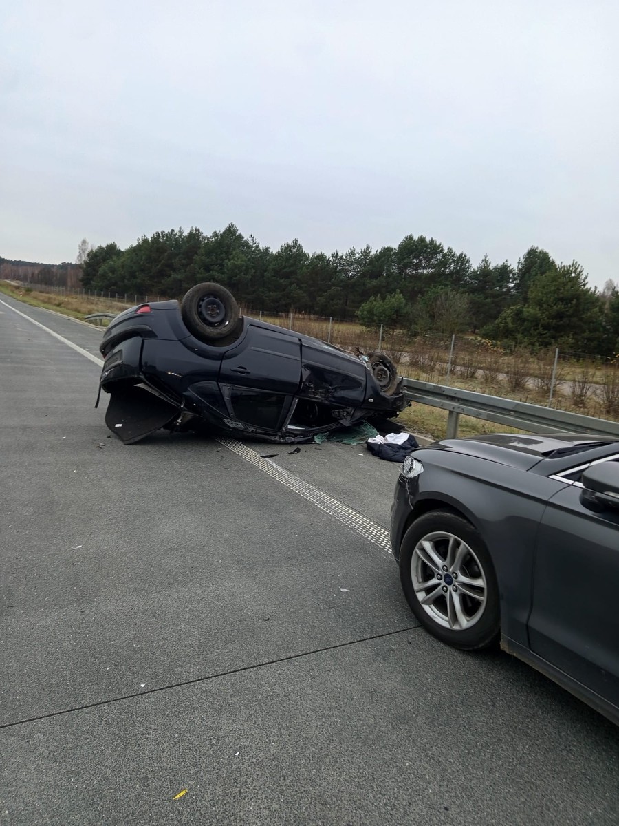 Jak wstępnie ustalili pracujący na miejscu funkcjonariusze wyszkowskiej drogówki, 34-latka z nieustalonych przyczyn zjechała na pas gruntowy oddzielający przeciwne kierunki jazdy, a następnie straciła panowanie nad pojazdem, doprowadzając do jego dachowania. Jadący za nią 53-letni kierowca, również Forda, uderzył w leżący na jezdni pojazd, natomiast kolejny uczestnik zdarzenia (63-latek) najechał na elementy karoserii rozbitych samochodów, w wyniku czego również uszkodził swój pojazd. Wszyscy kierujący byli trzeźwi. Kobieta z obrażeniami ciała, została przetransportowana do szpitala.