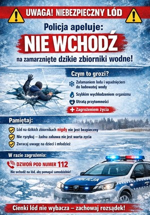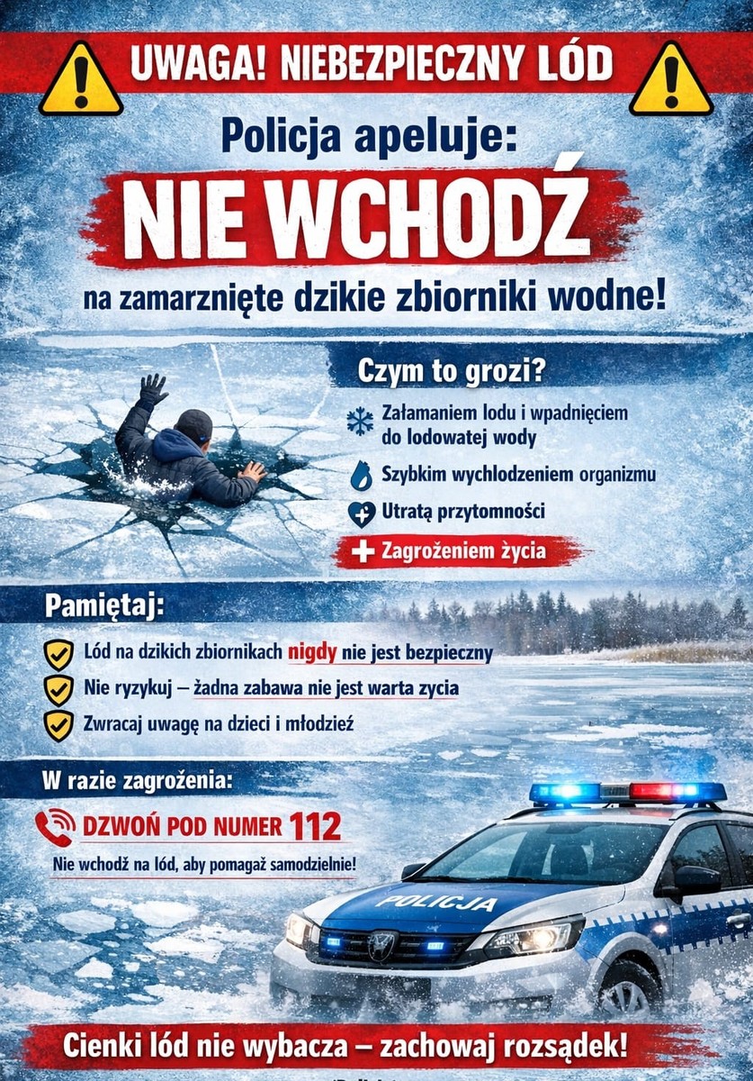 Co roku dochodzi do niebezpiecznych sytuacji związanych z załamaniem się pokrywy lodowej i utonięć w lodowatej wodzie. Dlatego policjanci przestrzegają przed wchodzeniem na lód i uważnie sprawdzają tzw. „dzikie lodowiska”, szczególnie pod kątem obecności na nich dzieci oraz wędkarzy. Pamiętajmy, że nie ma odpowiedniej grubości lodu, która zagwarantuje nam w stu procentach bezpieczeństwo! Nie wchodźmy na zamarznięte stawy czy rzeki a wybierzmy sztuczne lodowiska.