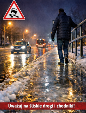 Pieszych prosimy o zachowanie ostrożności podczas poruszania się po chodnikach, przejściach dla pieszych i schodach.