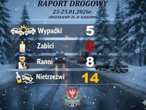 Miniony weekend tj. 23-25 stycznia br. na drogach garnizonu mazowieckiego upłynął bez wypadków ze skutkiem śmiertelnym, co jest szczególnie ważne w obliczu niesprzyjających warunków atmosferycznych. Śliska nawierzchnia, opady śniegu i niska temperatura stawiały dodatkowe wyzwania przed kierowcami i pieszymi, jednak rozwaga uczestników ruchu drogowego pozwoliła uniknąć najtragiczniejszych skutków.