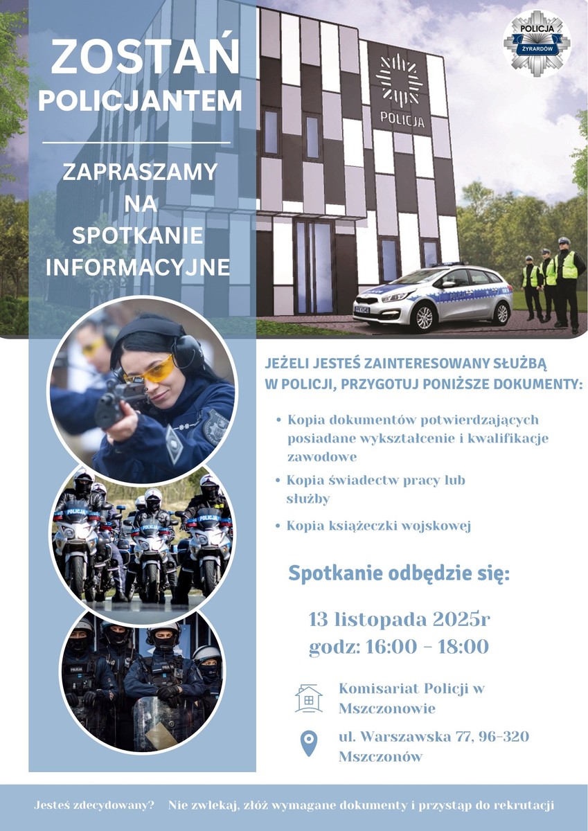 Policjanci z Komendy Powiatowej Policji w Żyrardowie zapraszają na spotkanie informacyjne dotyczące służby w Policji. Odbędzie się ono 13 listopada 2025 roku w godzinach 16:00 - 18:00 w Komisariacie Policji w Mszczonowie. To okazja, by porozmawiać o misji i wartościach, jakie niesie praca w Policji, poznać codzienne obowiązki funkcjonariuszy oraz dowiedzieć się, jak wyglądają poszczególne etapy rekrutacji. Spotkanie kierowane jest do osób zainteresowanych służbą w Policji i „widzą” się w służbie na rzecz bezpieczeństwa i porządku publicznego.