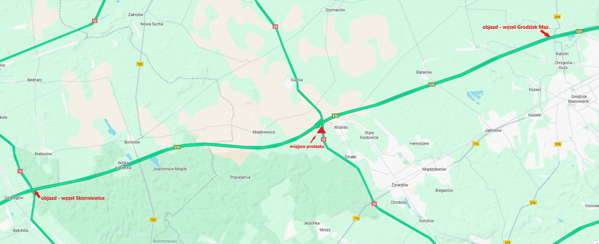 • Kierowcy jadący od Grójca trasa DK50 w kierunku węzła Wiskitki proszeni są o kierowanie się na  drogi S7, S8 lub W719