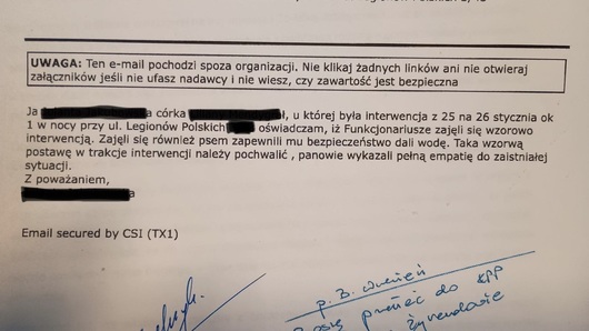 W miniony wtorek (3.02) takie podziękowanie wpłynęło na skrzynkę mailową Komendy Wojewódzkiej Policji z siedzibą w Radomiu. Autorka wiadomości w kilku zdaniach podziękowała policjantom za wzorową i pełną empatii interwencję przeprowadzoną w Żyrardowie. W nocy 26 stycznia funkcjonariusze Oddziału Prewencji Policji w Płocku podczas interwencji pomogli kobiecie, która złamała nogę oraz zajęli się jej psem, gdy jego właścicielka przebywała w szpitalu.