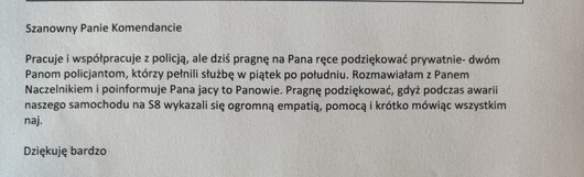 W poniedziałek, 23 lutego do Komendanta Powiatowego Policji w Żyrardowie wpłynął e-mail, w którym kobieta podziękowała patrolowi za okazaną empatię, pomoc, profesjonalizm i ludzkie podejście.